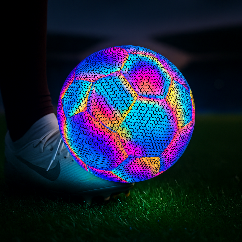 Ook zonder flits is het reflecterende effect zichtbaar. Of je nu overdag op het veld staat of ’s avonds op het strand een potje speelt – deze bal trekt áltijd de aandacht.